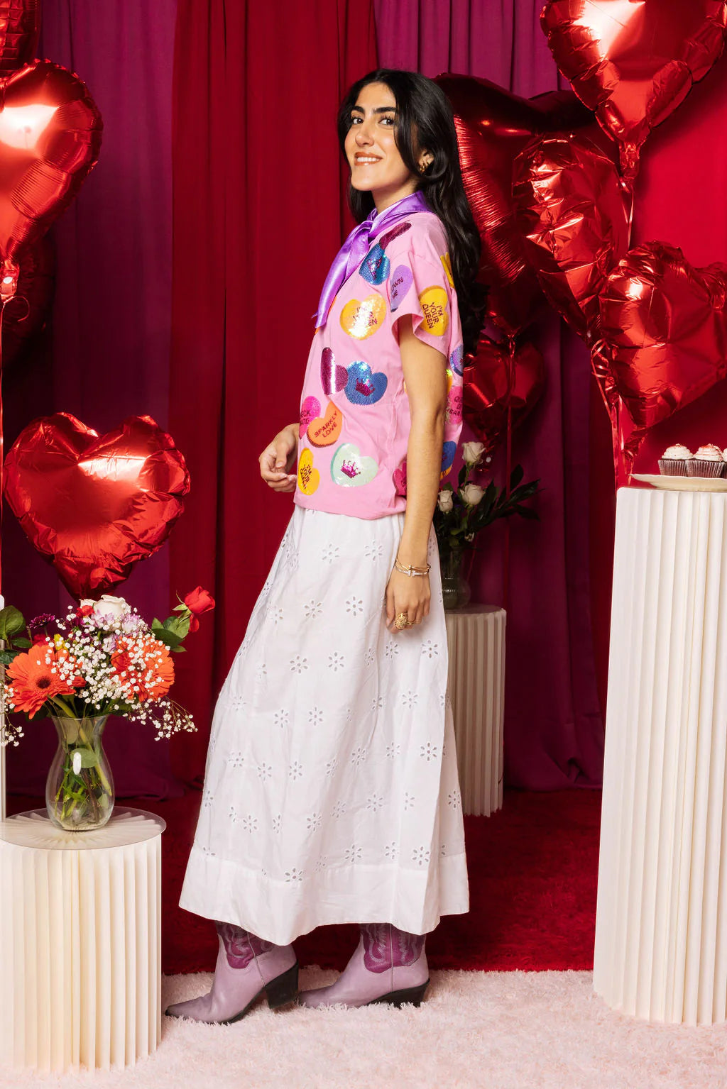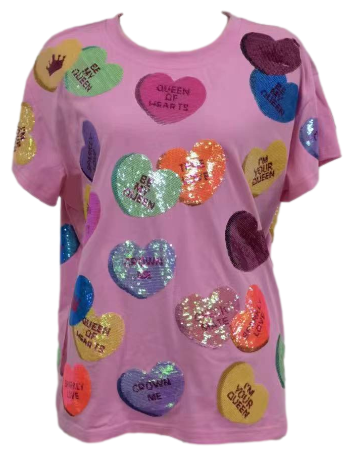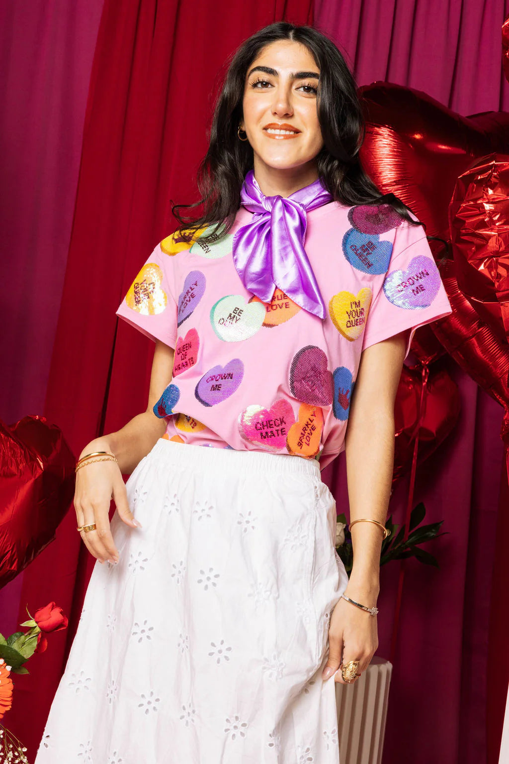 Looking for the perfect Valentine's Day shirt? Look no further! The Magenta Sequin Candy Heart Tee is a must-have. With a true-to-size fit and a beautiful sequin-scattered heart design, this tee is perfect for any Valentine's occasion, from a casual night in to the office.