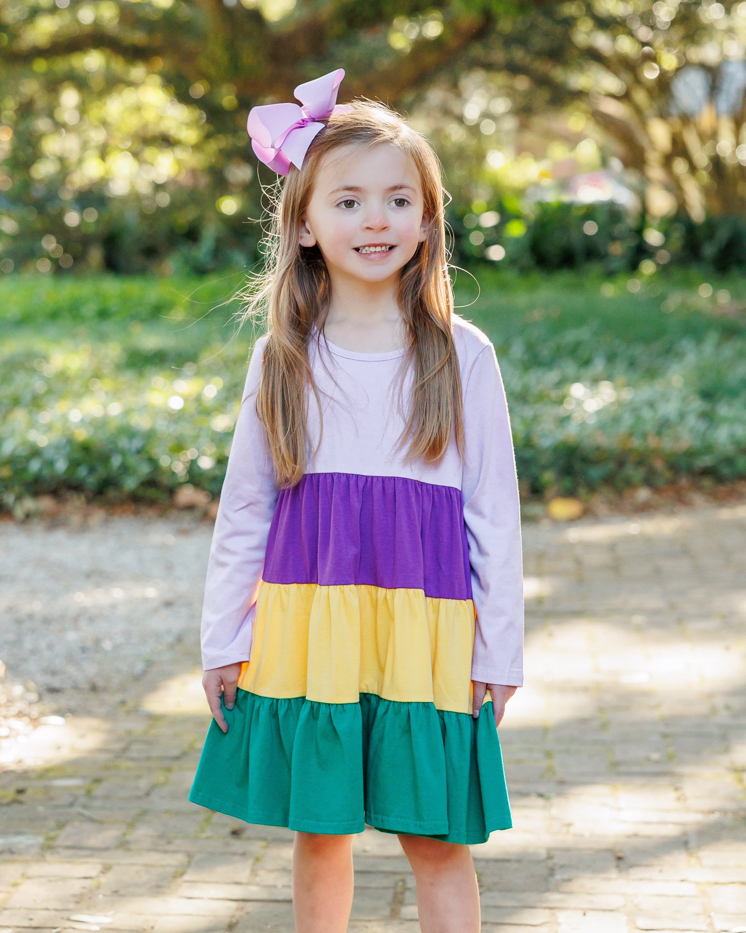 It's time to celebrate in the Mardi Gras Colorblock Twirl Dress. Fun & festive, it will have your little one ready to party all day long.