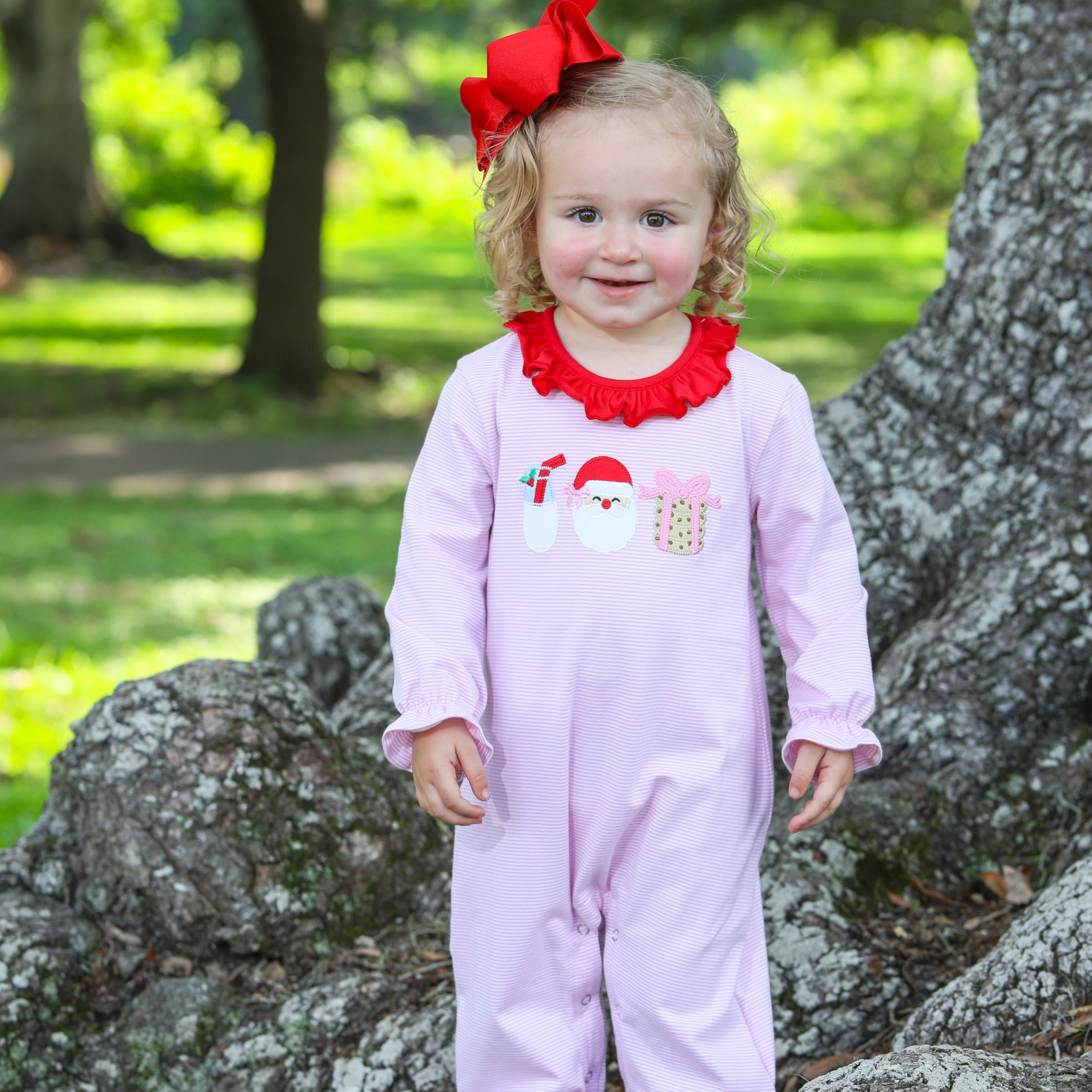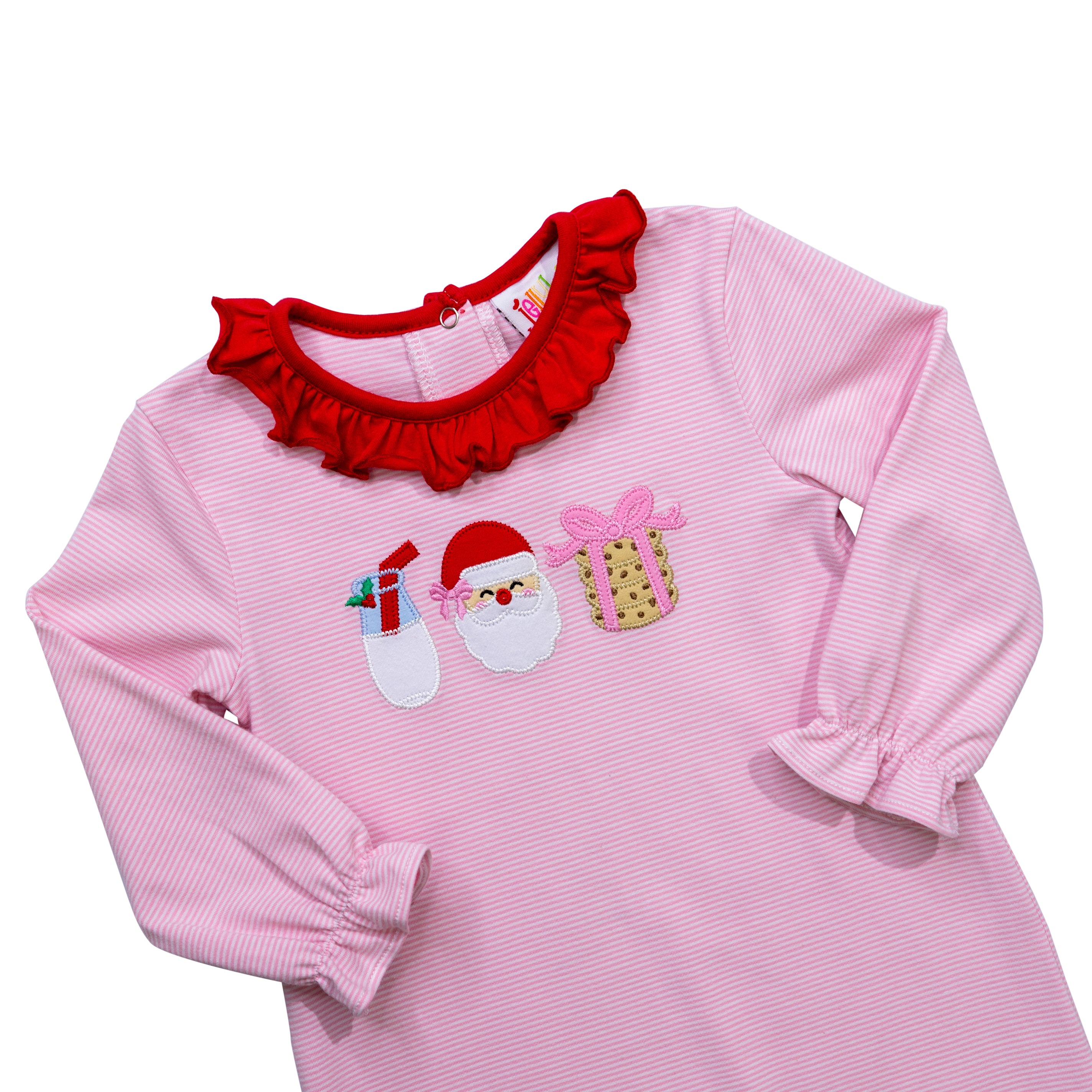 Get ready for some sweet dreams with this Milk and Cookies Ruffle Romper! The light pink stripe shirt features a trio applique of milk, cookies, and Santa. The red ruffle collar adds a pop of color. This playful romper will keep you comfortable and stylish. Check out our other Milk and Cookies outfits for a sweet sibling match.