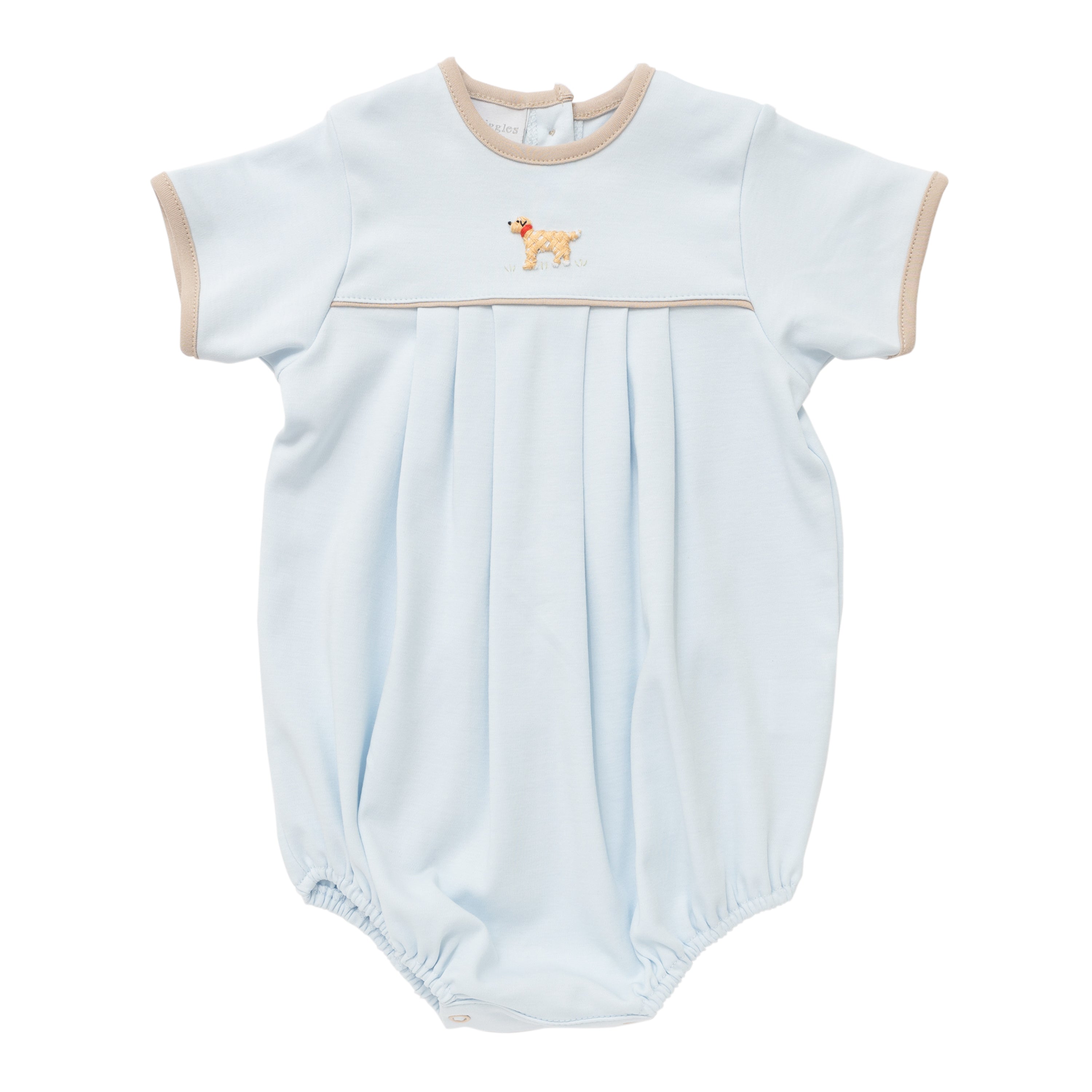 This playful Mini Winston pleated bubble is perfect for your little one! With a cute blue bubble with brown trim, and a mini dog. The pleated bubble adds an extra touch of fun to this already adorable outfit.