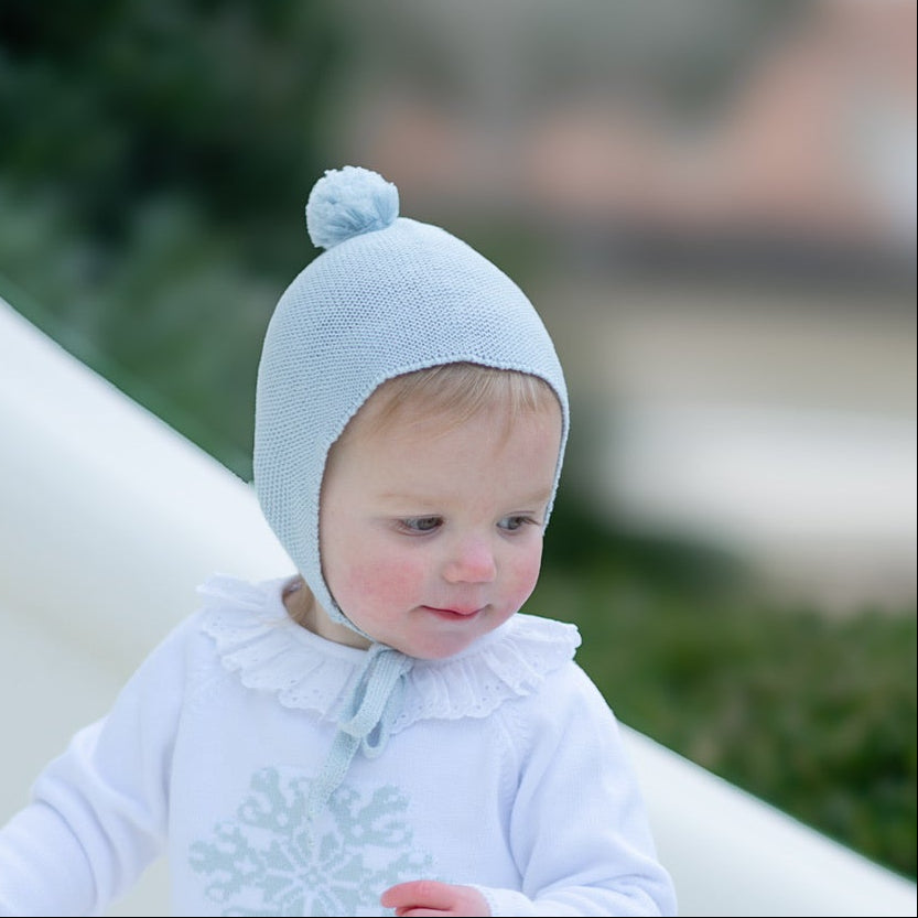 Complete your little one’s outfit with this charming light blue knit bonnet, crafted for both warmth and timeless style. Made from soft, cozy knit fabric, it features a playful pom-pom detail and secure tie closures to keep it perfectly in place. Gentle on delicate skin and beautifully classic in design, this bonnet is the perfect accessory for cooler days, adding an extra touch of sweetness to any ensemble.