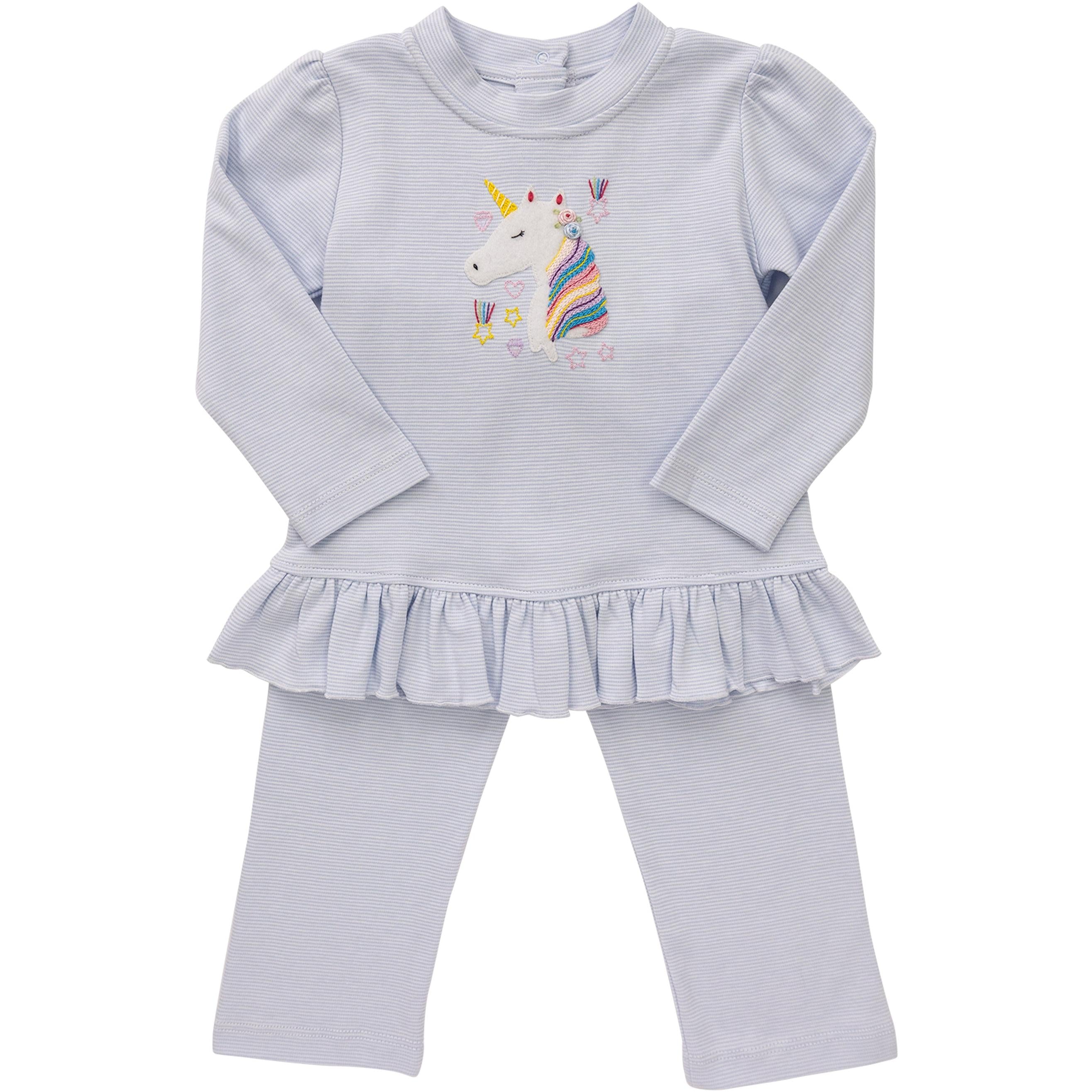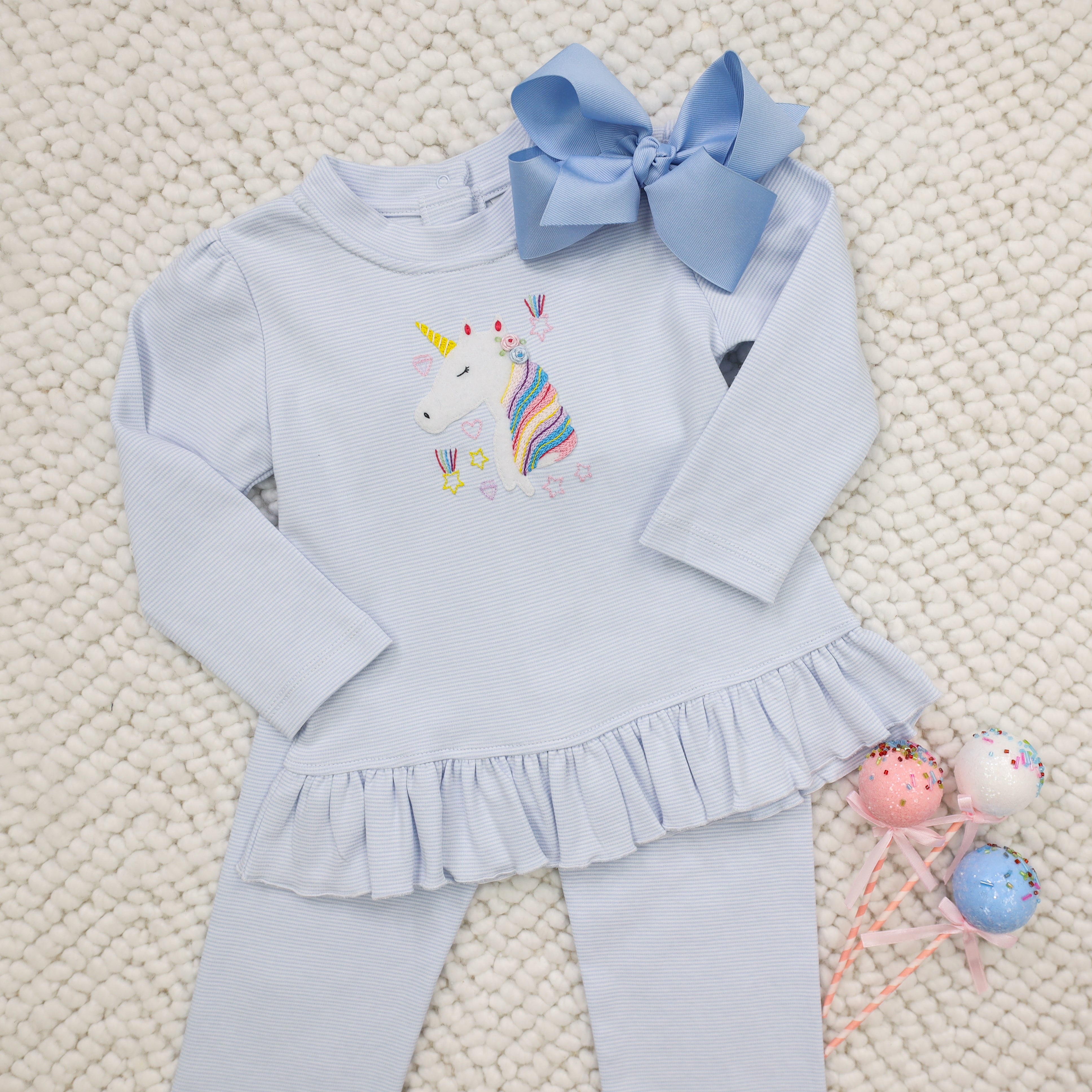 Let your little one prance and sparkle in the Rainbow Unicorn Ruffle Pants Set! Featuring a magical rainbow unicorn on the front with a playful ruffle at the bottom of the top, this set is perfect for fun-loving girls. Get ready for some seriously cute, enchanting adventures!