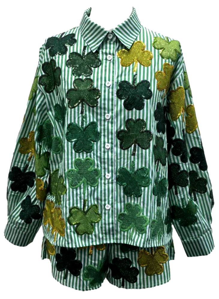 Queen of Sparkles- Green & White Striped Rhinestone Shamrock Button Up Long Sleeve Top- Green
