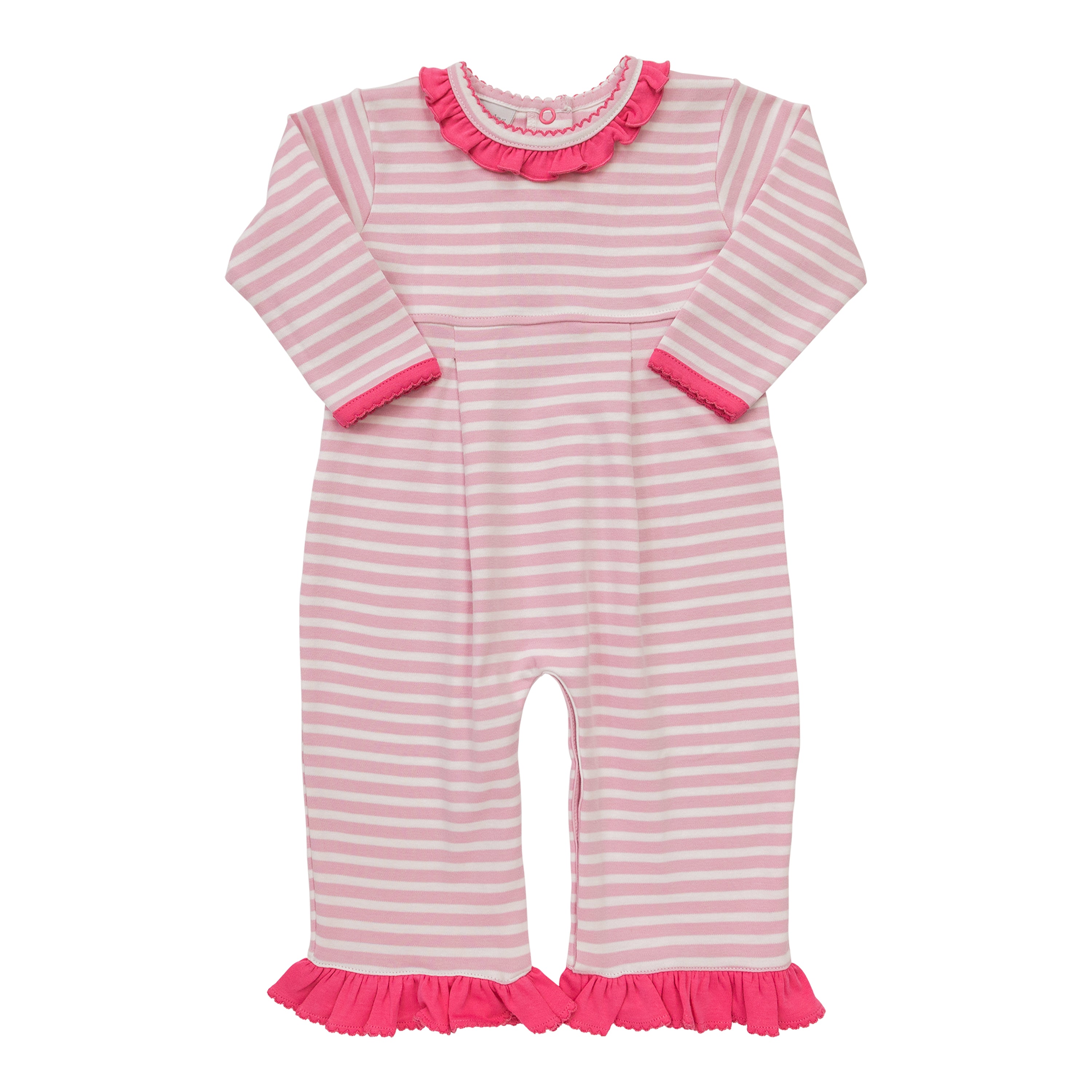 Get ready to ruffle some feathers in this playful romper! With a pink ruffled collar and hem, this pink stripe romper is perfect for a day out. Stay warm with long sleeves while looking cute and stylish.