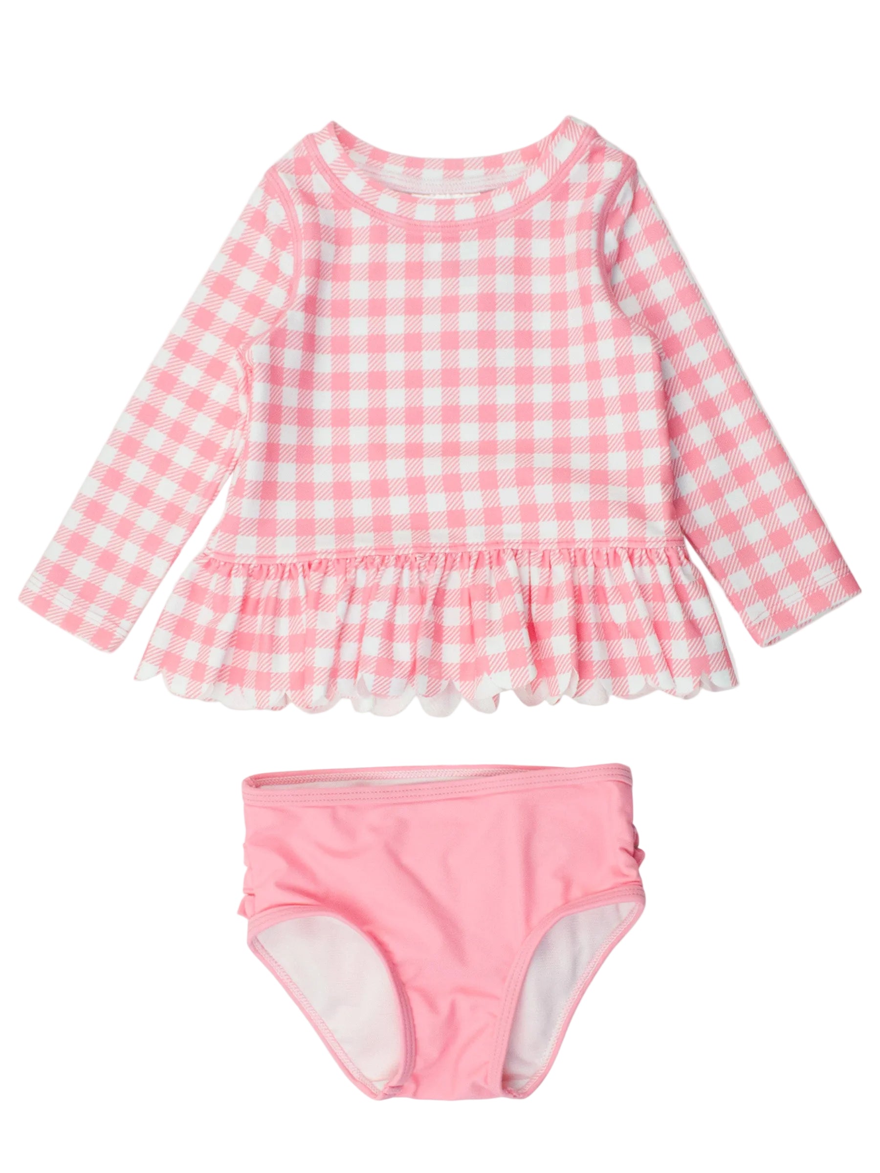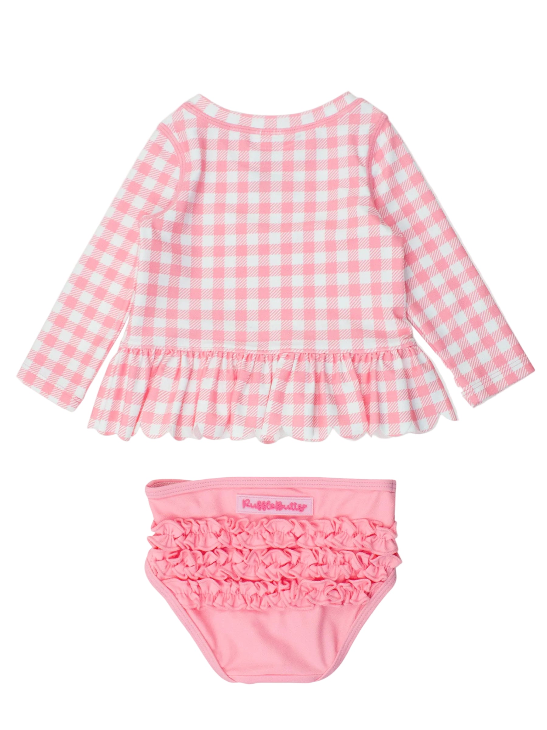 Ruffle Butts & Rugged Butts- Scallop Hem Long Sleeve Rash Guard 2-Piece, With Signature Rear Ruffles- Bubblegum Pink Gingham