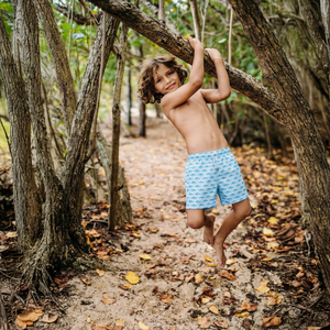 The Bermies swim trunks, crafted with 90% recycled polyester and 10% Lycra, offers incredible flexibility and comfort for active kids.