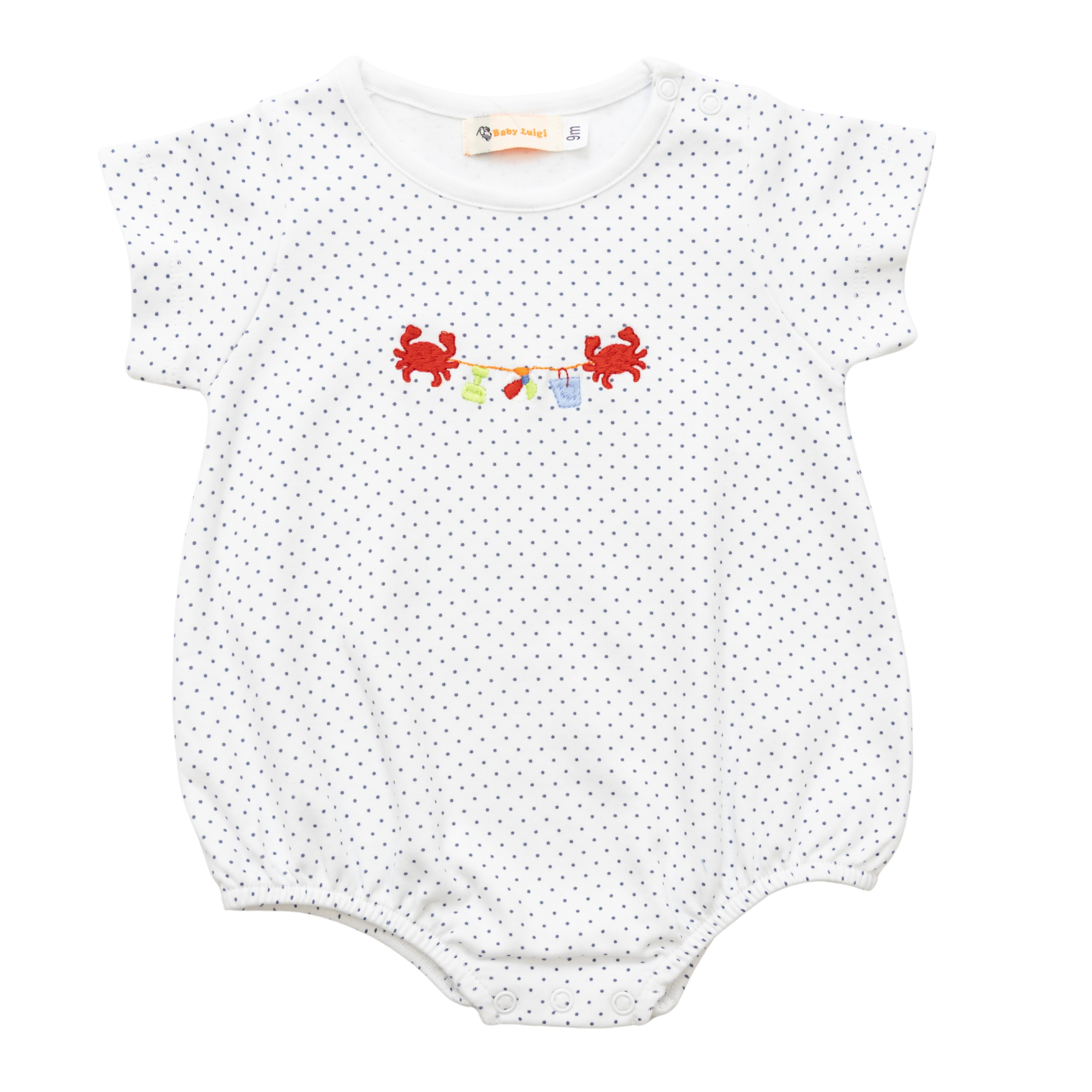 - Embroidered crabs with a beachy banner showcasing a shovel, bucket, and ball