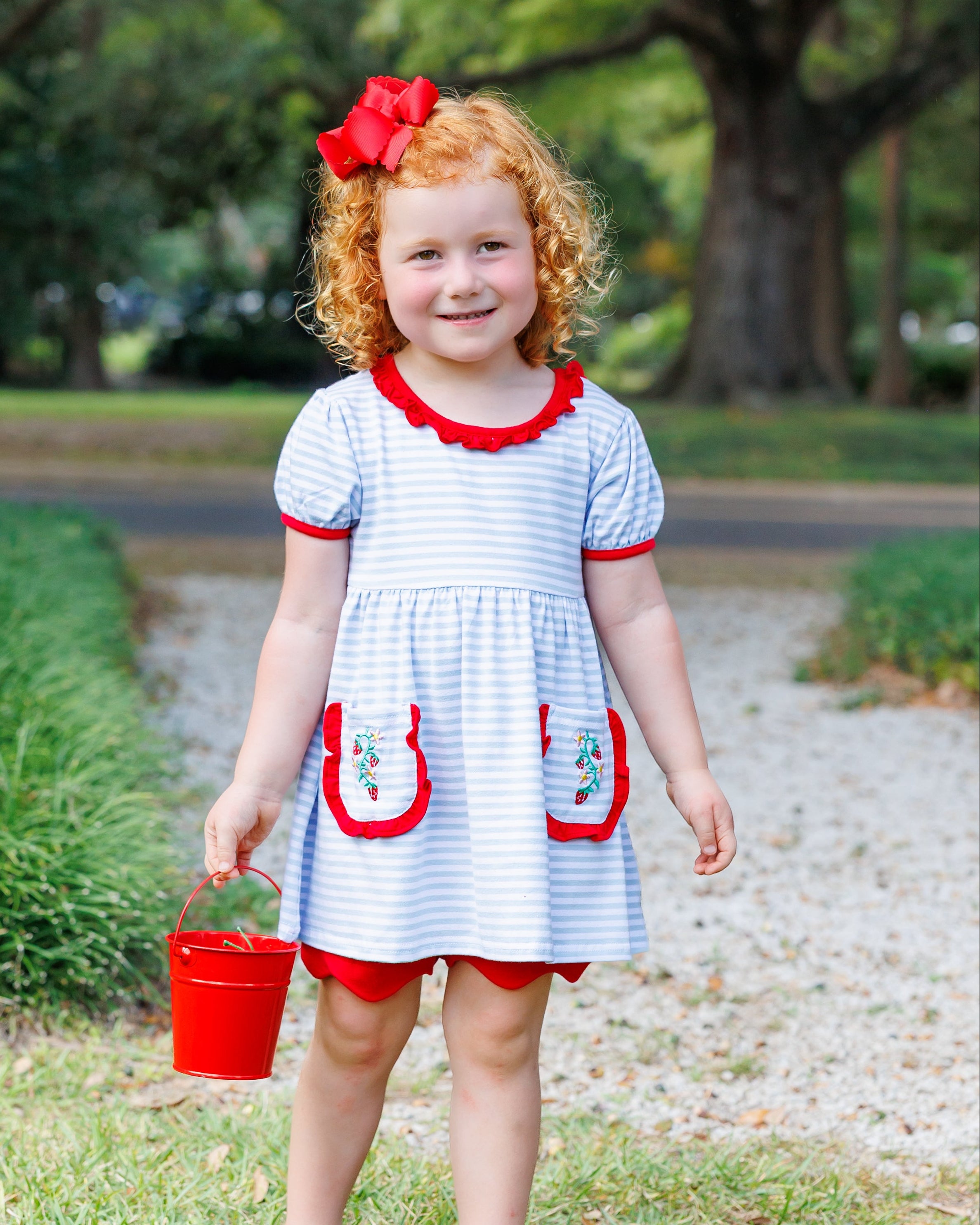 - Matching red scalloped shorts