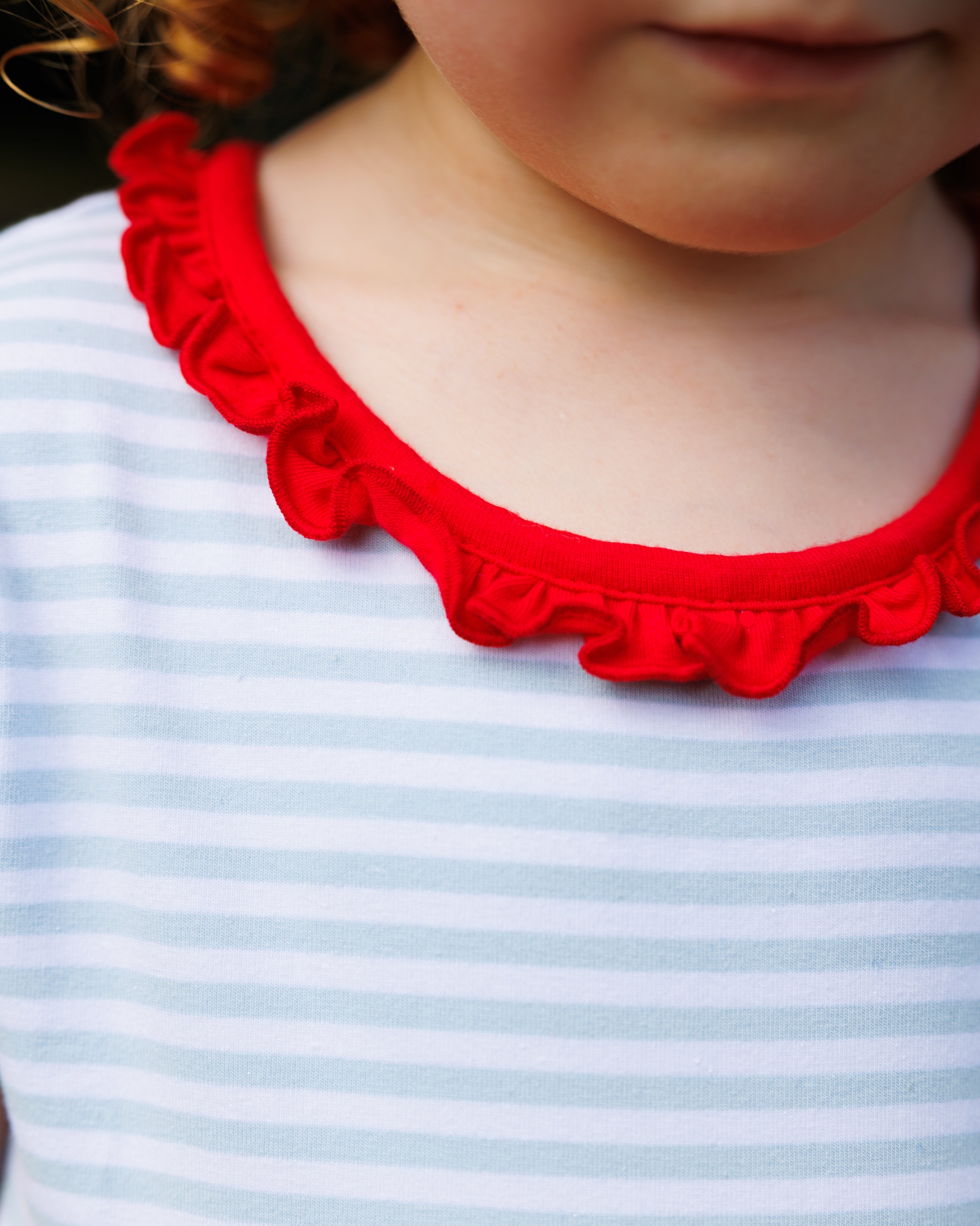 - Red ruffle trim on neckline and around functioning pockets