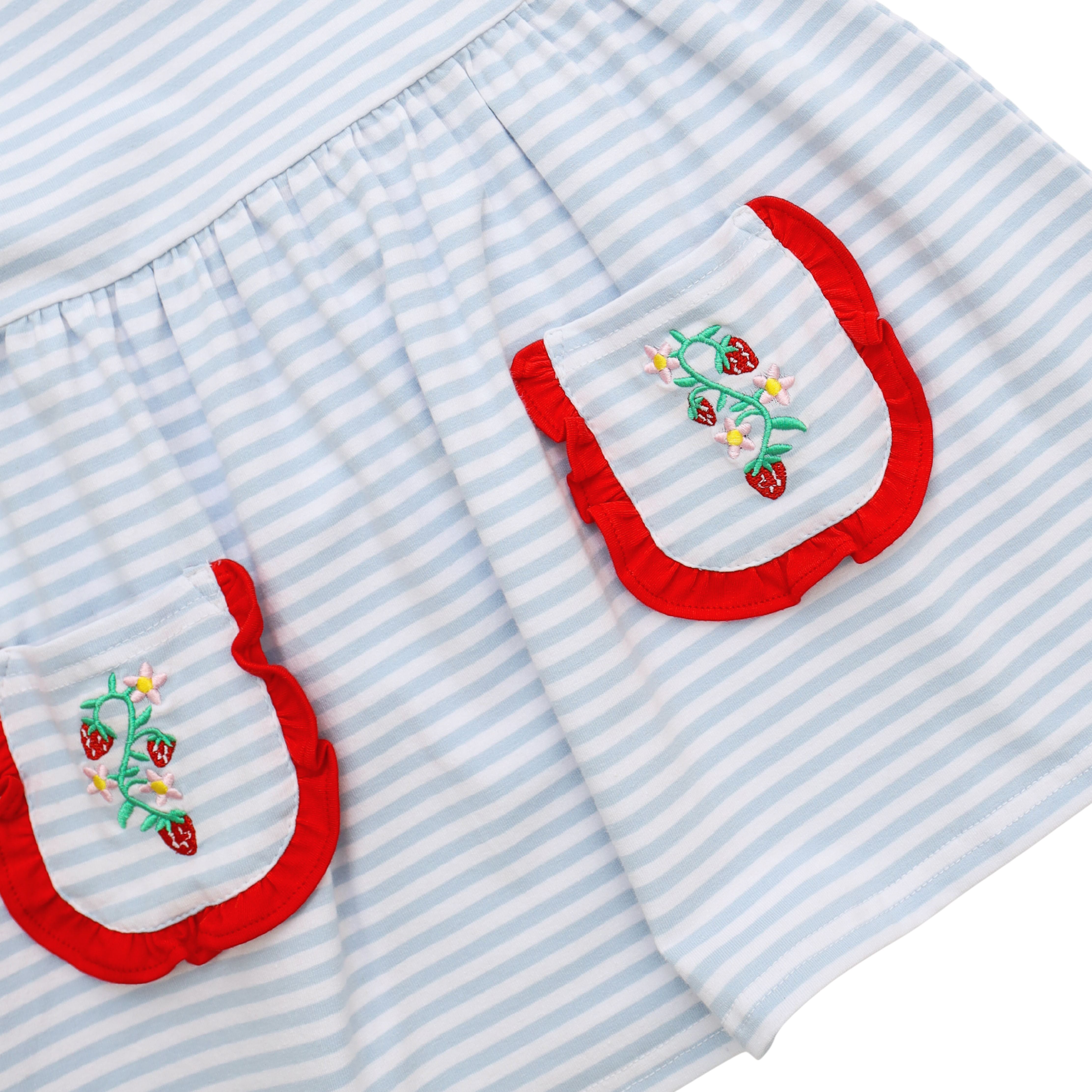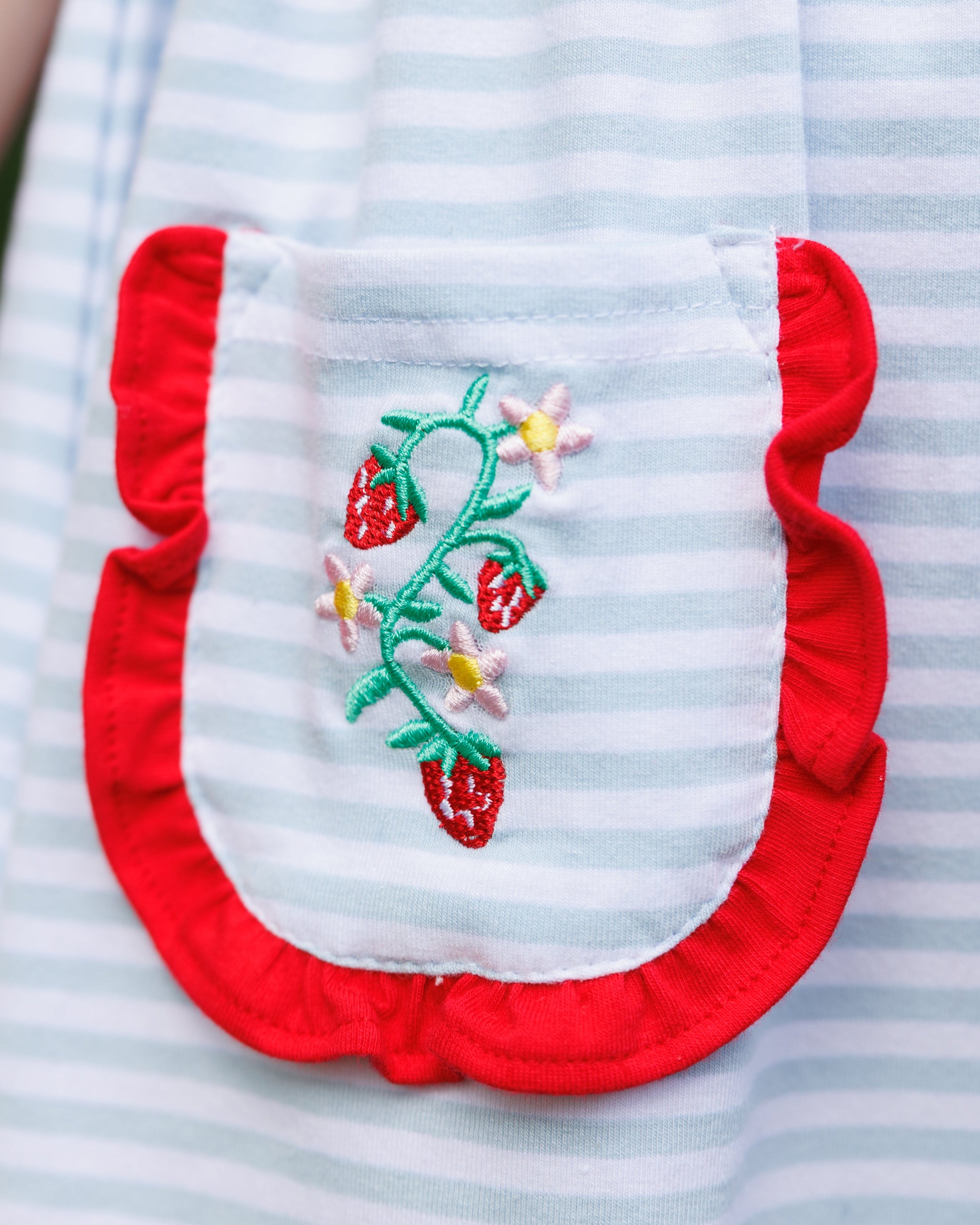 - Embroidered strawberry vines on each pockets