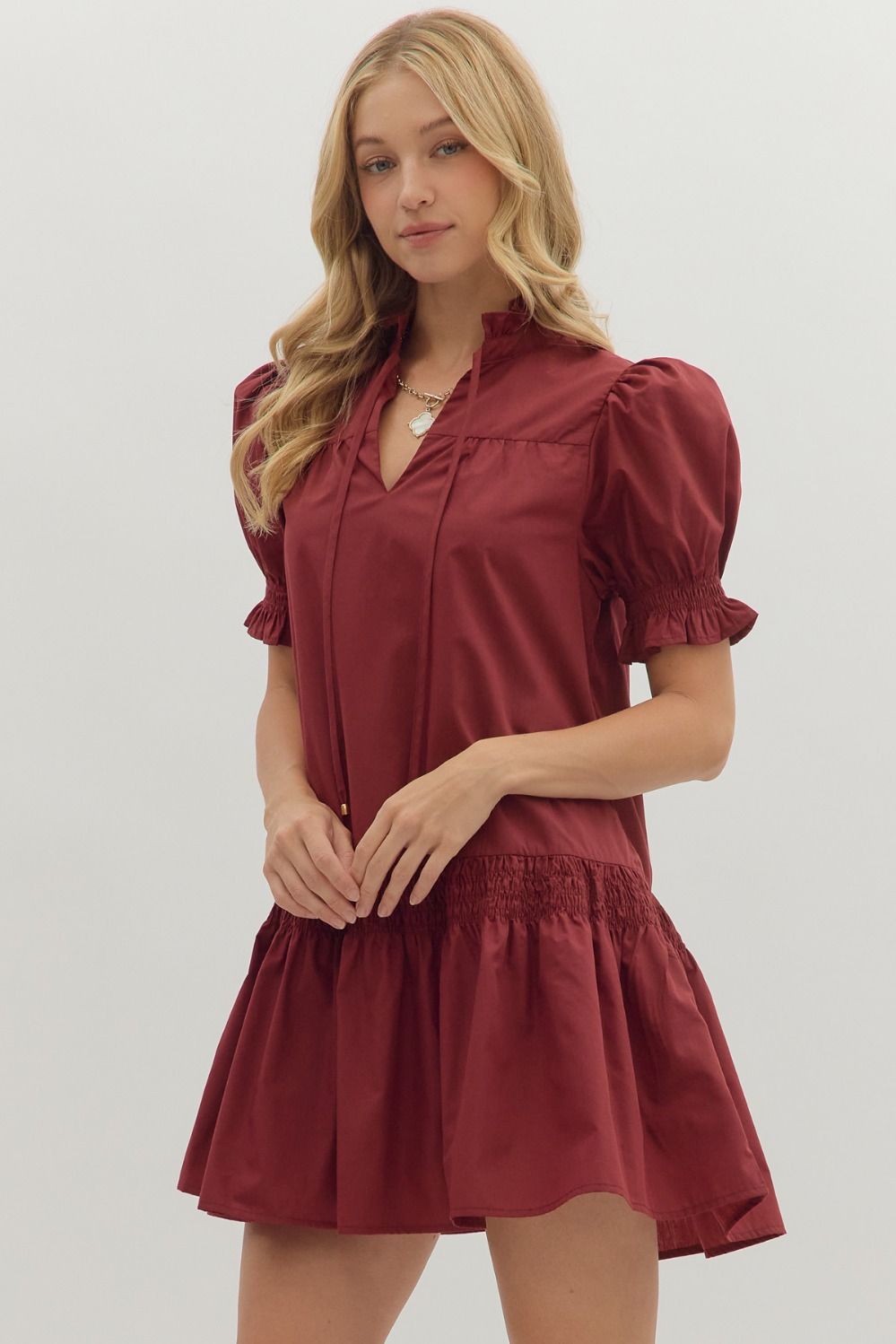 Solid short puff sleeve mini dress featuring ruffled band collar V-neck with self-tie detail. Smocked detail at sleeves and waist. Ruffle hem. Pocket at side. Lined. Woven. Non-sheer. Lightweight.