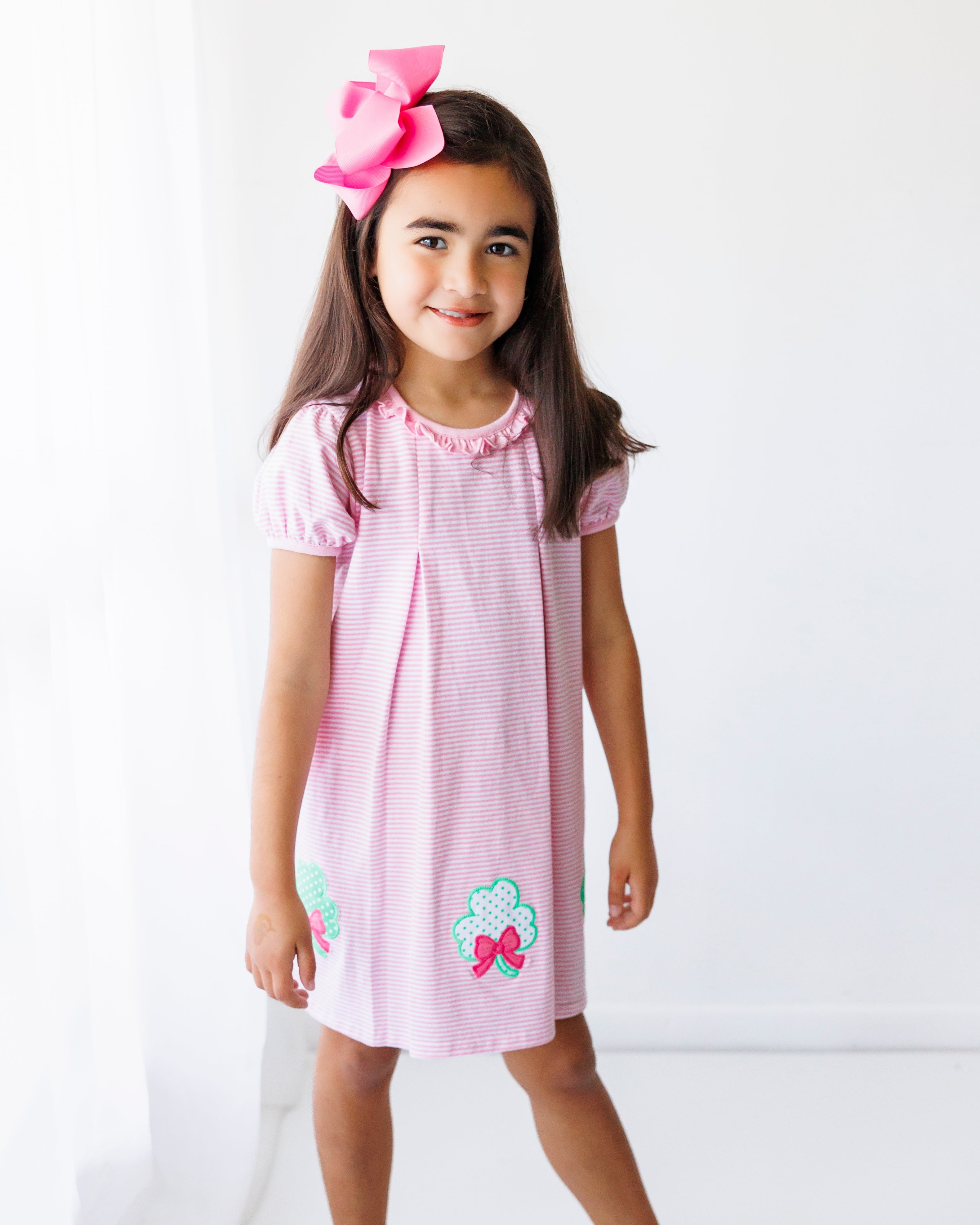 Get ready for spring with our St. Patty Pleat Dress. This pleated dress features delicate shamrocks appliqued on a soft pink stripe pattern. With a playful ruffle collar, this dress is
