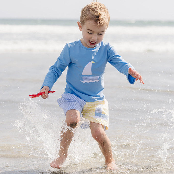 Make a splash in these Sailboat swim trunks! Perfect for boys, these blue & yellow gingham trucks add a playful touch to your pool day outfit. Matching rash guard available!