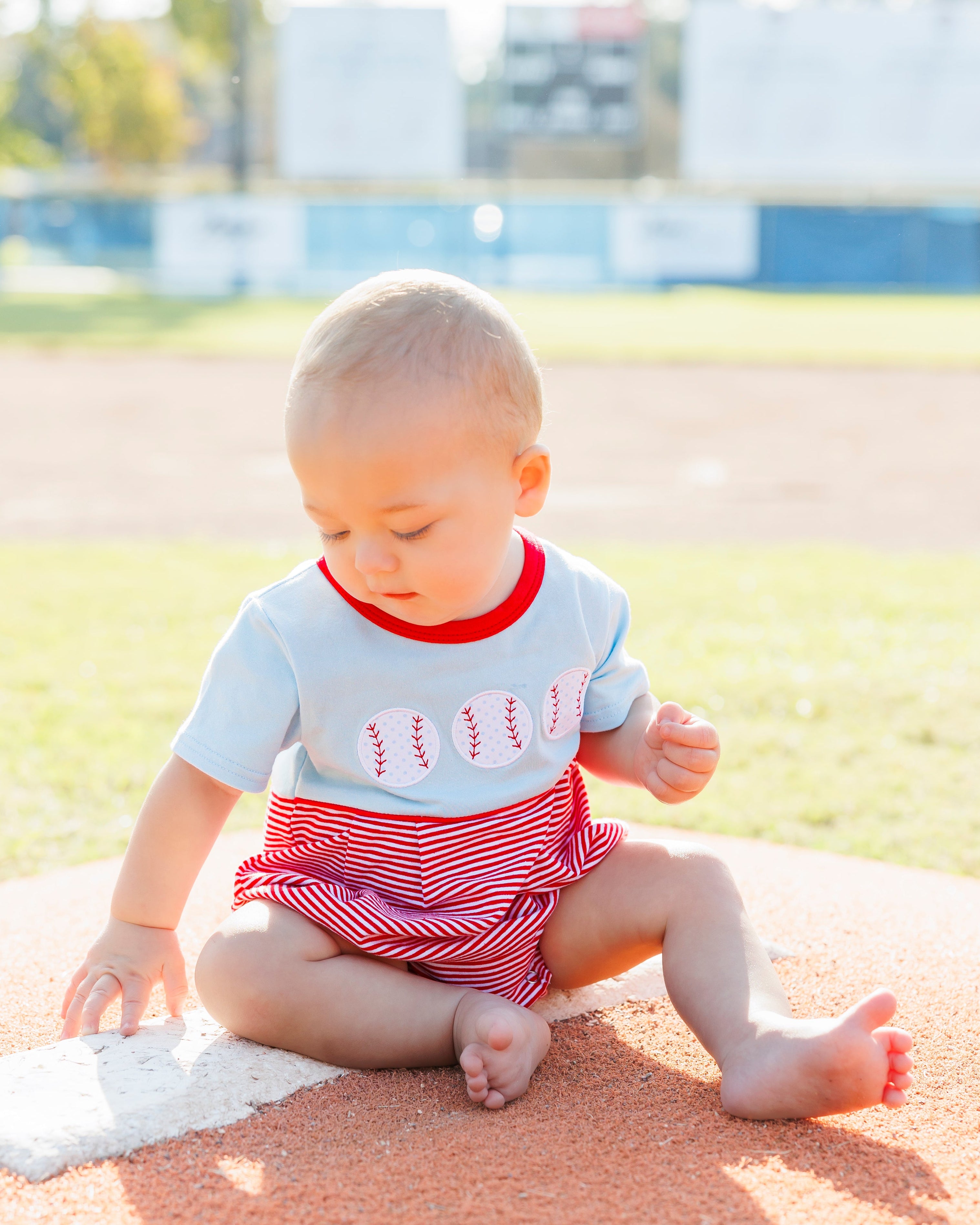 - Trio of baseball appliques on the bodice