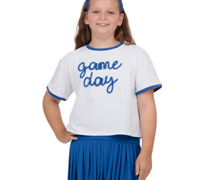 Celebrate game day in style with the Tinsel Game Day Ringer Boxy T-shirt for girls. Featuring "Game Day" in shimmering royal tinsel lettering on the front, this playful tee brings energy and team pride to your look. Its comfortable boxy fit makes it perfect for cheering from the sidelines or hanging out with friends.