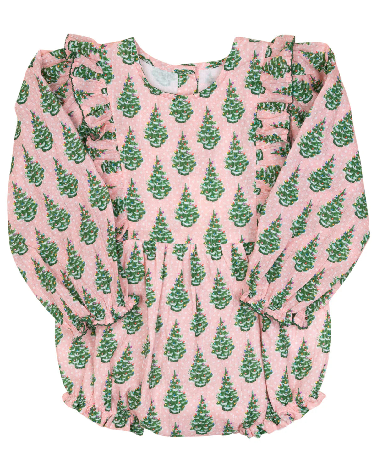 A festive favorite for your little one! The Vintage Ceramic Christmas Tree Bubble blends holiday charm with vintage-inspired elegance. Featuring a sweet Christmas tree print with silver lurex shimmer, ruffle accents, and long sleeves, this bubble is as cozy as it is adorable. The easy snap closures make diaper changes a breeze, ensuring both style and convenience this holiday season.