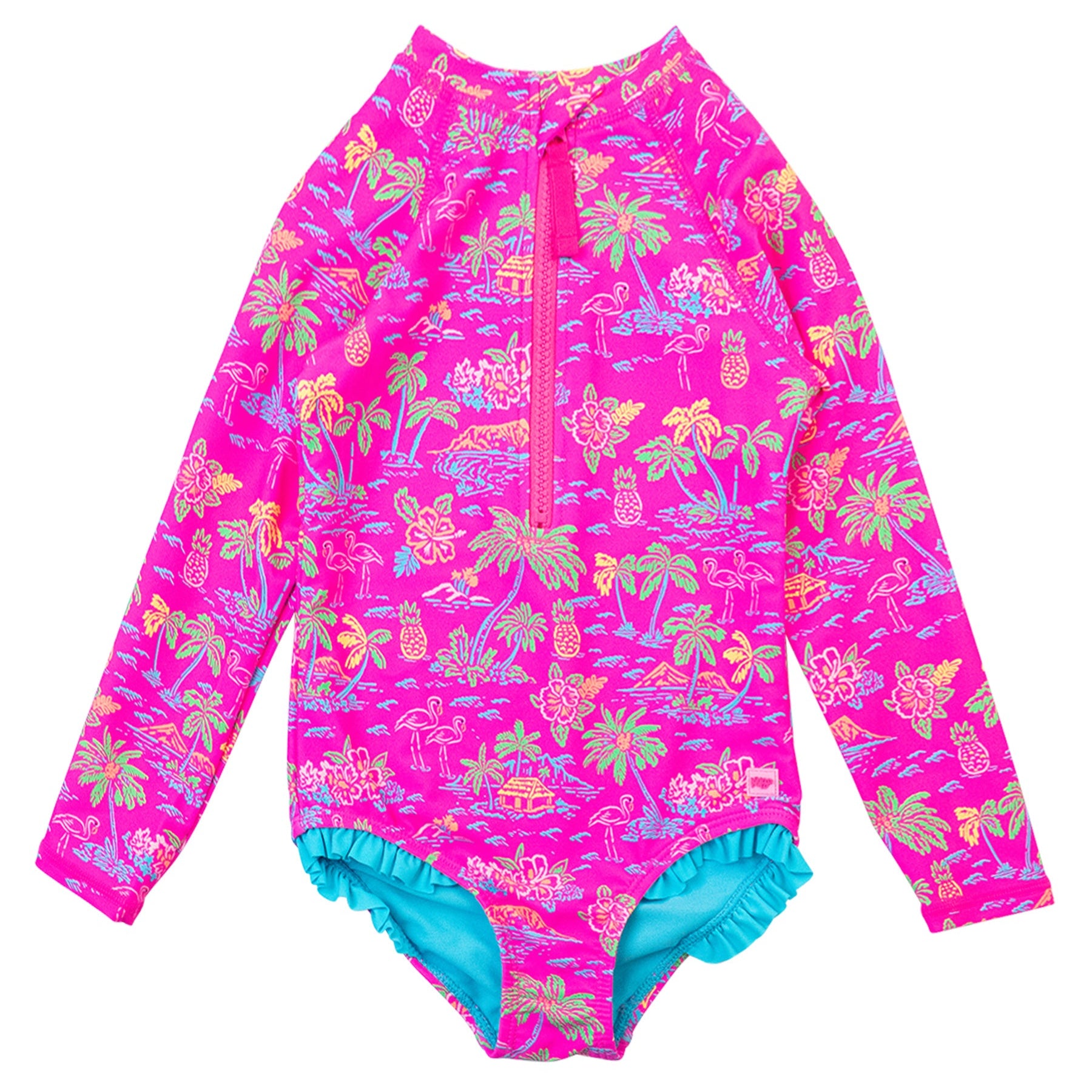 Ruffle Butts & Rugged Butts- Long Sleeve Zipper One Piece Rash Guard Swimsuit- Neon Island Time